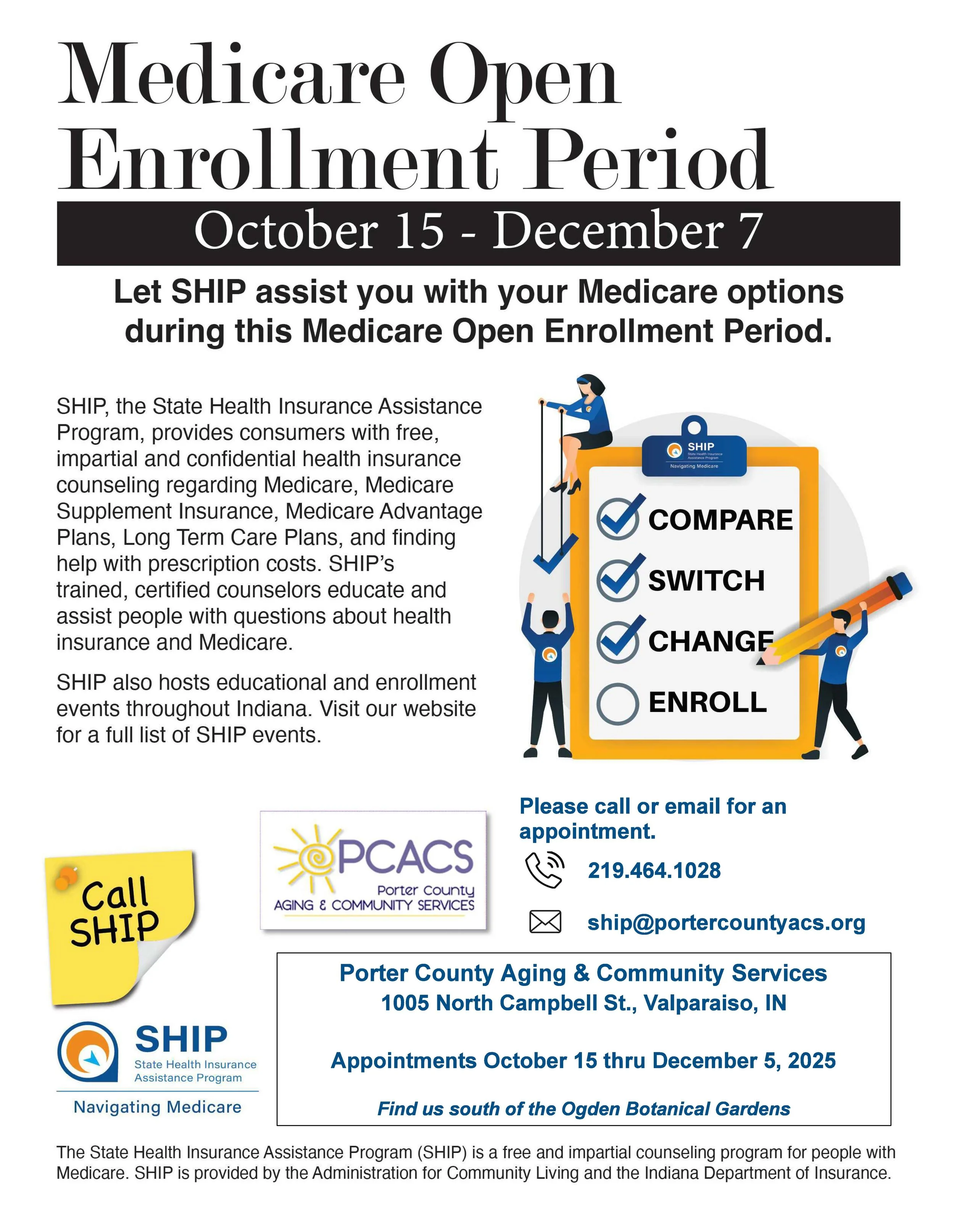 Let SHIP assist you with your Medicare options during this Medicare Enrollment Period. Call (219)464-1028 to make an appointment with our friendly certified counselors!